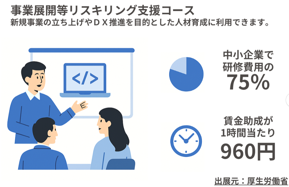 また、「人材開発支援助成金」の活用が可能で、研修費用の最大75%が助成されるケースもあります。