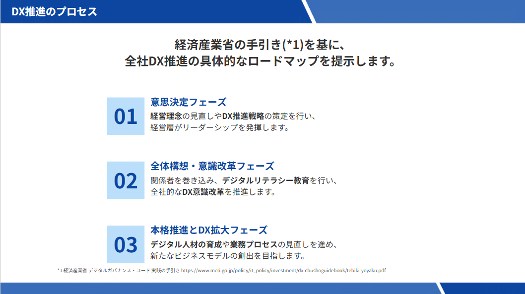 経産省のロードマップをベースに進めることで、現場が納得して最初の一歩を踏み出せるのです。