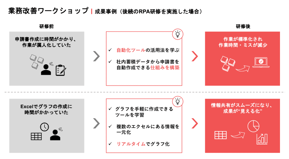 ワークショップを通して段階的に課題を改善していくことで、 成功体験が蓄積されます。