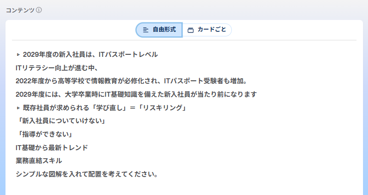 「2029年度新入社員はITパスポートレベル」について下記プロンプトを入力する。